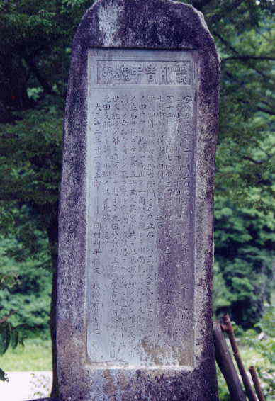 | この石碑は、河合村元田小学校跡地にあって、そこには、安政五年(1858年)に起きた飛越地震のとき、この地であった想像を絶する悲惨な出来事が記されています。 その内容に、向山の一角が欠け飛んで荒町の五戸と立石の四戸、元田の二つの村の53人が、その家とともに地中深く埋められたとあります。 石碑に近い所に元田商店(ガソリンスタンドと雑貨)があります。その主人の元田与喜三さん(1997年没)に聞くと、向山の岩石は、学校の跡地やもっと遠い元田鉱山(現村営グランド)の所まで飛んだのだと熱心に話されました。 河合村村誌の編集者のひとりで、河合村史に精通されている永田忠臣氏の話によると、唯一助かった女「おな」は、河合村天生(あもう)へ子守に行っていたため難を逃れました。「おな」は、その後、河合村保に嫁いだそうです。(舩坂 忠夫) |