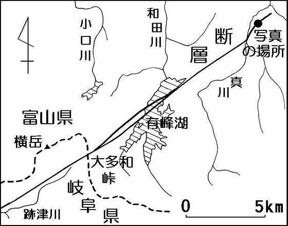 | 跡津川断層東端は富山県立山であり、ここで断層は消滅するが、端にも関わらずなかなか活動的な様相を示す。約二二万年前から始まる立山火山の噴火以前から、跡津川断層は活動してきた。立山火山形成に断層が何らかの役割を果したことは十分考えられる。 また、立山に見られる大きなカルデラ地形(陥没地形)は、阿蘇山のような火山活動でなく、大規模な山体崩壊による。この崩壊は、跡津川断層の活動が大きな原因となっていると考えられる。 一八五八(安政五)年の飛騨地震は飛越地震ともいう。名前のように飛騨だけでなく越中(富山)にも甚大な被害をもたらした。立山カルデラの内では大鳶(おおとんび)・小鳶山などが崩壊し、常願寺川の上流がせき止められた。その後、ダム状態になっていたところへ、雪溶け水とともに崩壊土砂が決壊し、土石流が一気に下流域へ流れ込んだ。その結果、潰家屋一六一三戸、溺死一四〇名の被害が出た。このことは、たとえ断層の端とはいえ、立山地域での断層活動が大きかったことを物語っている。 実際、立山に近い富山県大山町の真川の右岸の道路横に、大きな断層露頭(国天然記念物)が見られる。断層露頭とは、地下の断層が地表にむき出しになった所をいう。写真の右側(茶色、南東側)は、石ころがたくさん挟まった段丘れき層で、かつての湖に堆積した。左側(白色、北西側)は、岩盤をつくる花崗岩(元は地下深部でマグマが冷えてできた)である。花崗岩の側が断層運動により相対的に上昇した。この露頭では、断層が活動した時期は分かっていないが、近くでは、安政の飛越地震で動いた可能性が見られた。 富山県真川の上流、折立峠を越えると有峰(ありみね)湖に至る。有峰湖は人造ダムで、跡津川断層沿いにできたくぼ地だった所である。現在は観光地になっているが、湖底に沈んだ有礼(うれ)の村を思う時、一抹の寂寥(せきりょう)感を覚える。有峰湖を更に南西へ自動車道を進むと、大多和峠を経て岐阜県跡津川へ入る。 (岩田修・飛騨地学研究会副会長)2005年2月26日 |