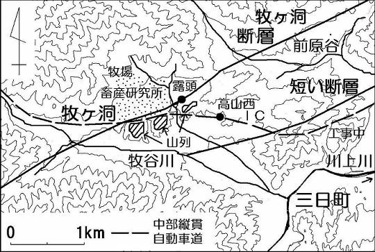 | 高山駅から西へ十`、車を二十分ほど走らせると、周りは美しい田園風景が広がる。二〇〇四(平成十六)年に開通した中部縦貫道高山西インターの北側の斜面に岐阜県畜産研究所がある。緩やかな斜面には二百頭あまりの牛が放牧され、牛はのどかに牧草を食べている。飛騨牛として有名な「安福号」もこの牧草を食べて育った。この付近は、古くは馬を野飼いしていたので牧ヶ洞とよばれる。 牧草地の斜面は、山すそから下へ中部縦貫道まで続いているが、そこから地面は逆に盛り上がる。つまり、二十〜三十bの小高い山列が斜面の末端をふさいで細長く延びている。牧場からは、縦貫道の下、山列の切通し道を下れば、国道一五八号線や牧谷川本流の谷に出られる。牧場斜面は牧ヶ洞断層を境にできた斜面で、隣の前原谷にも同様の緩やかな斜面がある。 山列は、牧ヶ洞断層の南東側の隆起(上昇)によるものだ。断層は高山市赤保木町付近から西南西へ延び、その長さは高山市清見町と荘川町まで全長約二十`である。牧ヶ洞断層は、三尾断層・夏厩断層とともに国府断層帯に含まれその最南端にある。さらに牧ヶ洞より東では、牧ヶ洞断層の南側に(短い断層をはさんで)高山盆地がある。牧ヶ洞断層は、高山盆地の北縁の形成に関係している。 また牧ヶ洞断層は、他の国府断層帯の断層と同じく「右ずれ断層」でもある。そのため航空写真で小さな川を見ると、断層を境に反対側の流路が二十b程度右にずれてクランク状になっている。 牧ヶ洞断層では、二〇〇一(平成十三)年にトレンチ(掘削)調査が行われた。調査によると平均的な横ずれ速度は、千年あたり〇・七b、活動間隔は三千六百年から四千三百年程度だという。 清見町の山は広葉樹林も多く、秋には鮮やかな紅葉が見られる。この秋ドライブをかねてのどかな牧場へ出かけ、安福号を育てた豊かな自然を満喫されてはどうだろう。 (笠原喜之・飛騨地学研究会会員)2005年9月17日 |