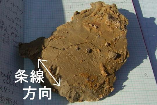 | 岐阜県は、二〇〇〇〜〇一(平成十二〜十三)年に清見町大倉滝の上流で牧ヶ洞断層の発掘調査を行なった。調査では、牧ヶ洞断層が動いた最新の時期を、断層活動によって切られた地層の年代測定などから約四千七百年前以後と推定した。 二〇〇四(平成十六)年十二月、飛騨地学研究会は、清見町牧ヶ洞の岐阜県畜産研究所近くの洪水調整池のり面で、牧ヶ洞断層の露頭(断層断面が見える部分)を発見した。数日後、ここを管理する高山国道工事事務所にお願いし詳しく調査させていただいた。 露頭の最下部(基盤)の岩石は周辺に広く分布する濃飛流紋岩類で、それを覆って砂礫層が堆積していた。基盤岩の内部には、いくつかの断層が見られ、そのうちの一本の断層は、砂礫層にも食い違いを生じさせていた。 砂礫層は、地表面を含む川の土砂であるので、最近(数万年前以降)堆積したものだ。その砂礫層が断層で切れていれば、断層は砂礫層堆積後、数万年前以降に活動したといえる。つまりこれは、地質の時間でいえば最近活動した断層と思われた。 この断層面を慎重に掘り出したところ、基盤岩の一部が断層運動によって滑らかに磨かれた面が表れた。このような断層面を「断層鏡肌(だんそうかがみはだ)」という。さらにこの断層鏡肌やそれに接していた粘土面上からは、断層運動によって生じた幾本かの筋状模様が観察された(写真)。 この筋状模様は「条線」と呼ばれ、断層面がこすれた跡である。条線は、断層のずれ動いた方向を正確に知る貴重なデータとなる。今回見つかった条線の向きから、牧ヶ洞断層の最近のずれの運動が分かった。条線によると、断層運動は、垂直ずれよりも横ずれの成分が大きい。主に右横ずれ(断層の向こうが右にずれる)で、南東側の地盤がわずかに(水平から角度九度程度)ずれ上がる運動をした。南東側の小山の列は、この運動の累積で上昇したものだ。 (寺門隆治・飛騨地学研究会会員)2005年10月1日 |