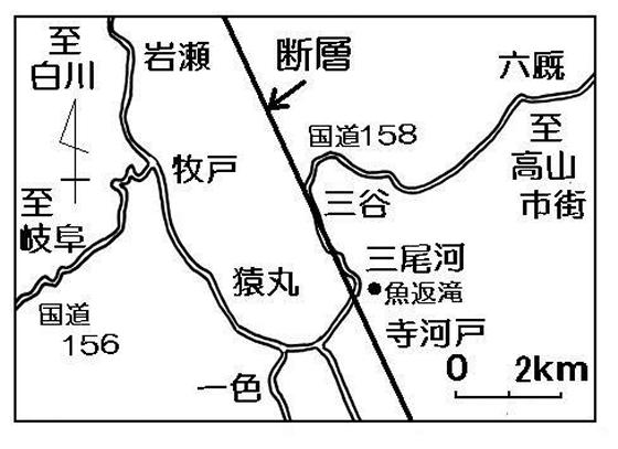 | 冬の朝、飛騨の東西を結ぶ国道一五八号線を清見インター方面から西へ向かい、高山市荘川町三谷(さんたに)までくると、フロントガラスから朝日が射し込む。まばゆい朝日を背にして走って来たはずなのにと、とまどってしまう。 これは、南西へ向かっていた国道の道筋が、三尾河(みおご)断層の谷にぶつかり、「く」の字型に南東に折れ曲がっているからだ。(地図参照) この谷は、三尾河断層が百万年近くかけて活動した結果つくられたものである。北西〜南東方向の三尾河断層は、荘川断層帯(御母衣断層系)の南部分であり、北部分の白川断層(御母衣断層系)と同じく断層の向こう側が左へずれている。 また上下方向のずれをみると、断層の南西側が隆起(上昇)している。南西へ向かう国道は、隆起した断層の南西側の壁にとおせんぼされて、やむなく断層に沿う方向に曲げられたようにみえる。 道路が変な方向に曲がっていたり、直線的な谷にそってまっすぐ続くとき、そこに断層がある可能性が高い。 断層の真上、荘川町三尾河のマトバ橋から百bほど東に魚帰り滝がある。この滝をつくる岩盤は、数千万年前にマグマが固まった硬い岩石である。断層による岩盤の破壊は、この滝まで及んでいない。横幅が広く庄川の源流を落とすこの滝は、清涼感でいっぱいである。 三尾河から南の断層付近には、標高千二百bを超えるなだらかな地形のダナ高原があり、とても柔らかく甘い味のキャベツなど、高冷地野菜が栽培されている。三尾河断層は、近くの大原(おっぱら)断層とともに飛騨高地の代表的な断層といえる。 写真は、マトバ橋より三谷方面を見たものである。谷に沿う断層は手前より奥に続く。道路をたどり正面の山の稜線を見ると、断層上のくぼみ(わずかなへっこみ)が見受けられる。 (鷲見浩・飛騨地学研究会会員)2005年7月2日 |