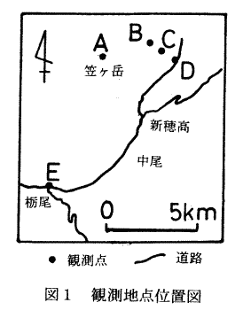 | (1) はじめに 1999年の夏季に笠ヶ岳とその周辺4ヶ所、2000年の夏季に笠ヶ岳4ヶ所、黒部五郎岳4ヶ所に、気温と相対湿度の自記記録センサーを設置した。これらのデータからわかったことは、夏季晴天日の気温と相対湿度の変化パターンは高度によって異なることである。(中田、2000)。今回、笠ヶ岳4ヶ所の気温・相対湿度の日変化と、山麓の栃尾のアメダスデータによる風の日変化を比較したところ、気温・相対湿度が山谷風に関係していることがわかったので報告したい。 |