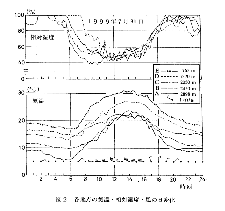 | 夏季晴天日における笠ヶ岳周辺の 気温・相対湿度と風の日変化 |