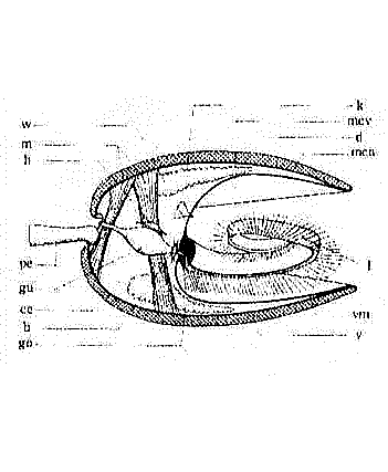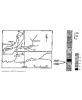 | 第1図 腕足類の構造(湊 正雄ほか、1981古生物学各論3より抜粋) | 第2図 化石産地位置図と森部層柱状図 (1:頁岩, 2:砂岩頁岩互層,3:砂岩,4:礫岩,5:石灰質基岩の礫岩,6:石灰岩) なお、化石産地位置図(第1図)と森部層柱状図(第2図)は堀越ほか(1987)と田沢ほか(1993)の図を利用した。 |