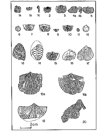 C地区から採集した腕足類化石標本を第7図〜10図にまとめた。 図版 1 (すべて実物大)(A地区のみ) |