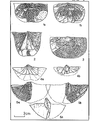 | 2.森部層について 丹生川村森部地域には飛騨外縁帯の地層が分布しており、それらは呂瀬層(デボン紀前期,後期),荒城川層(石炭紀中期〜後期),森部層(ペルム紀前期〜中期)に分けられる。森部層は頁岩,砂岩を主体とし、一部、石灰岩,礫岩を含む。化石は主に森部層下部層の中部に集中し、ウミユリ,コケ虫(Polypora, Fenestellaな ど),腕足類,二枚貝,四射サンゴ,頭足類、巻貝、三葉虫(Pseudophillipsia),植物などの化石を含む。また、森部層下部層の下部からは、石灰岩からフズリナ(Pseudofusulina fusiformis)が産出し(Yamada & Yam-ano,1980)、森部層中部層からは、砂岩よりフズリナ(Monodixodina sp.)が産出する(田沢ほか,1993)。 3.腕足類とは 腕足類とは、海生無脊椎動物の仲間である。古生代カンブリア紀前期(約5億7千万年前)に出現し、古生代に最も栄え、現在も衰えてはいるが生存している。外観は二枚貝に似ているが、二枚の殻の形が異なり(茎殻と腕殻に区別される)、複雑な内部構造を持っていること から二枚貝ではなく、むしろ、コケ虫に 近い動物である。基本的には、二枚の殻の結合部分にある穴から、肉茎が伸び、その先端で岩や海底の小石,ウミユリなどに付着して固着生活し、プランクトンをエサとしている。そのため、分散移動が制限され、動物群の地域的特性が比較的はっきりしているので、古生物地理学的資料として適している。 4.森部層の腕足類化石 腕足類化石は、森部地域の数地点に産出する。いくつかの産地のうち、A地区とC地区について述べる。(第2図 参照) (1)A地区の腕足類化石 A地区は石灰質頁岩層を主体とする。ここからはコケ虫(Polypora, Fenestella)が多産し、その他に腕足類,二枚貝,ウミユリ,四射サンゴ,頭足類,巻貝,三葉虫(Pseudophillipsia)などが産出する。腕足類は、ほとんど押しつぶされた状態で保存されているが、殻の破損はほとんどない。小型のものが多く、殻は離れてしまっていることが多い。合殻のものも少ないが産出する(第6図参照)。これらの腕足類は、平板状のコケ虫であるPolyporaやFenestellaが密集する頁岩層から多く産出する。一方、棒状のコケ虫を多産する石灰質頁岩層からは腕足類の産出が少ない。それらの二つの層は数10p間隔で交互に重なる。また、コケ虫の遺骸は壊れやすいが、それがほとんど壊れずに残っていることから、現地性(堆積された場所に生息していたことを指す)か、または、ごく近くに生息していたものが流され堆積したものと思われる。 次にA地区から産出した代表的な腕足類化石を示す。なお、温暖系(テチス型)と、寒冷系(ボレアル型,両極型)の区別は、田沢(1992)を参考にした。また、図版1にA地区から産出した腕足類化石をスケッチした。 Storophomenida (ストロフォメナ目) Davidsoniacea (ダビデソニア上科) Derbyia sp.(寒冷系) Chonetacea (コネーテス上科) Chonetes sp. Chonetinella sp. Mesolobus sp. Productacea (プロダクタス上科) Transennatia gratiosa(温暖系), Urushtenoidea sp.(温暖系) Cancrinella sp.(寒冷系),Waagenoconcha sp.(寒冷系) Linoproductus sp.(寒冷系),Permundaria sp.(温暖系) Lyttoniacea (リットニア上科) Leptodus nobilis(温暖系) Spiriferida (スピリファー目) Spiriferacea (スピリファー上科) Spiriferella sp.(寒冷系) Reticurariacea(レティクラリア上科)Phricodothyris? sp. Rhynchonellida (リンコネラ目) Stenoscismatacea(ステノスキスマ上科)Stenoscisma margaritovi(寒冷系) Atrypida (アトリパ目) Retziacea (レッチア上科) Hustedia sp.(寒冷系) |