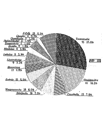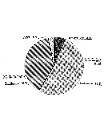 | 第3図 A地区腕足類化石の個体数と割合 | 第4図 A地区腕足類化石の個体数による目と上科の割合 |