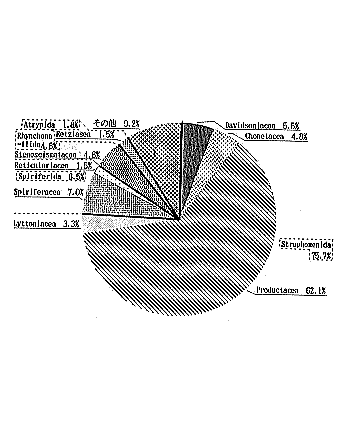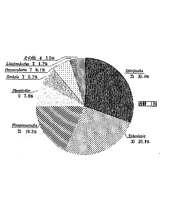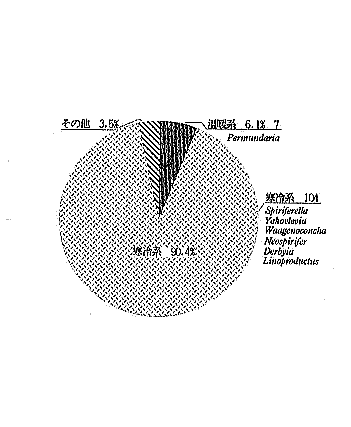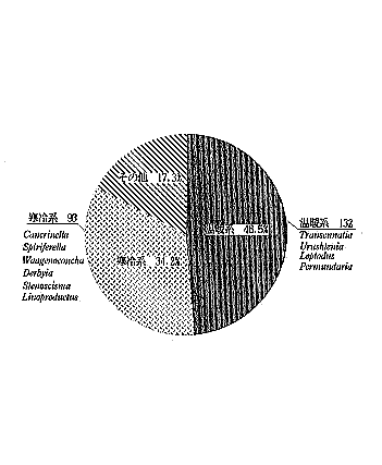 | A地区から採集した腕足類化石標本の内容を第3〜6図まとめた。これらの円グラフは筆者が採集して標本にしたものを、個数を元に集計してまとめたものである。よって、若干の差はある。一つのデーターとして考えて頂きたい。 A地区は、少なくとも15属以上の腕足類を産出し、その中でも温暖系の小型のTranseーnatia gratiosaやUrushtenoideaを多産する(第3図)。そのため、温暖系の割合が4属で48.5%と多く、寒冷系は6属で34.2%となっている(第5図)。このことから、A地区に堆積した腕足類は、やや、温暖な海に生息していたと考えられる。(つづく) (2)C地区の腕足類化石 C地区はA地区とほぼ同層準と思われ、硬質細粒砂岩を主体とする。この層からは、腕足類化石を主体とし、他に二枚貝,頭足類,植物の破片などの化石を産出する。腕足類の殻は、それほど押しつぶされていないが、殻が溶けていることが多く、雌型や内型が多い。また、大型〜中型のものが多く、殻は離れてしまっていることが多い。合殻も少ないが産出する(第10図)。保存状態は普通で、殻の破損はほとんどない。これらの腕足類は一般に散在的に産出するが、塊状に密集することもある。これらのことから、付近に生息していたものが流されて、大型〜中型の腕足類がC地区に堆積したものと考えられる。また、植物の破片を少量、産出することからC地区は陸地に近い場所だったと言える。 下記にC地区から産出した代表的な腕足類化石を示す。また、図版2にC地区から産出した腕足類化石をスケッチした。 Strophomenida (ストロフォメナ目) Davidsoniacea (ダビデソニア上科) Derbyia sp. (寒冷系) Productacea (プロダクタス上科)Yakovlevia kaluzinensi(寒冷系), Waagenoconcha sp.(寒冷系), Linoproductus sp.(寒冷系),Permundaria sp.(温暖系) Spiriferida (スピリファー目) Spiriferacea (スピリファー上科)Spiriferella sp.(寒冷系)Neospirifer sp.(寒冷系) |