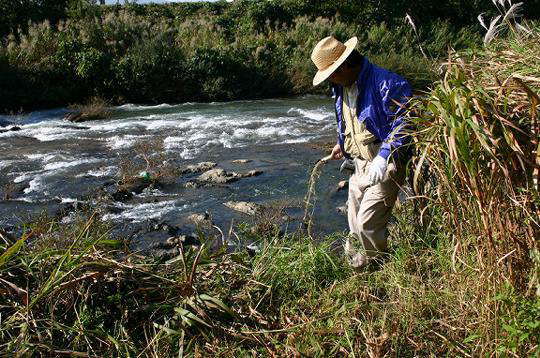 10月17日(日)に秋の巡検を行いました。今度、31日の岐阜の地学を学ぶ会との合同巡検下見をかねています。朝8時に市民文化会館に行ってみると誰もいませんでした。しばらくすると、岩田副会長、そして清水治さんが来ました。天気は快晴、しかしこの3人かと思っているとやはりそうでした。学校は行事が多いのでしかたないかもしれません。岩田副会長は、鎌を持って来るように書いたのが悪かったと冗談のように言いました。 まず行ったのは原山スキー場付近の露頭です。ここでは、松原礫層を観察できます。松原礫層は、濃飛流紋岩を主体とした円礫層で河川堆積物です。また松原礫層は、分水嶺の南側、美濃帯に含まれるチャートの礫も含んでいるので、現在の宮峠分水嶺のない頃、南方の久々野、小坂方面から流れて来た礫に由来すると言えます。 次に松本町の宮川河川敷に行きました。ここでは、飛騨外縁帯の結晶片岩と濃飛流紋岩の境界を見ることができます。草刈鎌を持ち出して、河川敷の草刈をすること ここで、小坂光三先生にお願いして丹生川村の化石を探すことにしました。携帯をかけてみると、家にお見えになりました。これで4人、上野平の火山灰層露頭付近の草刈りをして、丹生川村板殿(いたんど)に行きました。 板殿の林道脇を見ると、石灰岩がごろごろしていて、ここには化石がありそうです。美濃帯に含まれる石灰岩ということでした。さっそく石ころを拾うと、フズリナがありました。他の会員は山の斜面を登りましたが、中田会員は林道脇を丹念に捜しました。すると、フズリナもありましたが、風化面に浮き出たウミユリが見つかったではありませんか。喜んだのは言うまでもありません。 それから日面(ひおも)の神社で昼食を取りました。上宝火砕流堆積物の柱状節理を見て、江名子断層の地形写真を撮影し帰路に着きました。最後、清水さん宅で化石鉱物コレクションを拝見しました。 |