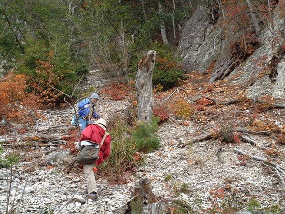 霧が出ていれば、今村峠から山頂に登り、そこから崖に下る予定でしたが、上広瀬から急斜面を登ることにしました。モモの果樹園の緩斜面を行くと、工事中の看板があったので、自動車を止めて歩きました。すぐに、堰堤をつくっている工事現場がありました。そこの岩石は凝灰岩のようです。ここから、山道をたどっていきました。急斜面を登りきると山の稜線になり、崖が見当たりません。少し降りると、下から「オーイ」と声があったので、西寄りの尾根を降りると崖がありました。