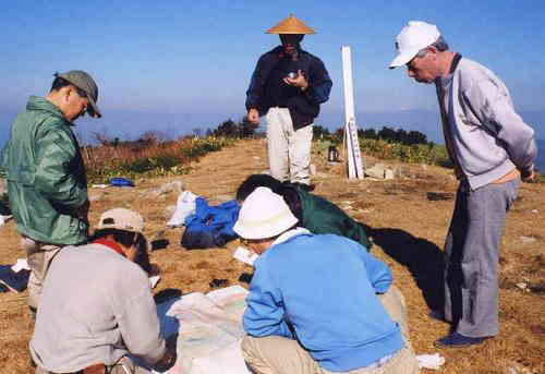 稜線まで登ると展望が開けています。青空の下はもえぎ色のササ原です。向こうにドーム状の山頂が見えます。山頂に着くと10人程の登山者のグループと会いました。萩原側から登ったようです。広々とした気持ちの良い山頂です。御岳、乗鞍、槍、穂高、黒部五郎、白山――――と展望も欲しいままです。そして高山盆地の霧はもう上がっていました。登山口から山頂まで、休み休みで約2時間でした。会誌には1時間と書きましたが、もう少しかかりました。ここで昼食と思っていると、なんと―――来ていないはずの木下さんが登って来ました。後から追いかけてきたようです。しかも、登山道を1時間で登ったというから驚きです。