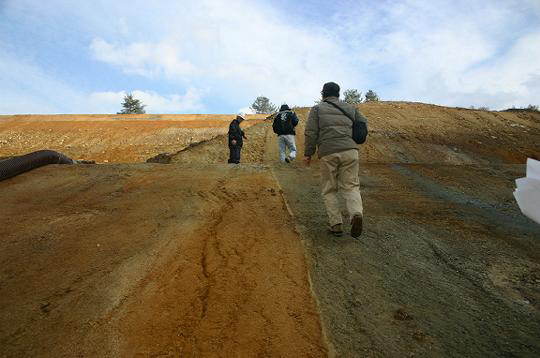 | 12月12日(日)に、5日から延期した今年度4回目の巡検を行いました。8時30分、集合場所の古川道の駅に行くと、今回は続々集まりました。総勢6名、岩田、鷲見、笠原、舩坂、岩塚、中田が集まりました。さらに途中からの参加者、寺門、三宅を含めると、8名の参加者でした。 盆地霧が出ていたので、いったん盆地から出て猪伏山トンネルから夏厩に抜けることにしました。予想どおりトンネルを抜けると、そこは晴れていました。夏厩の東海北陸道の近くから集落の向こう(東方)を見ると、反対側の山には直線状の谷があります。ここが断層の場所です。断層がちょうど川を横切っていたので、そこに断層破砕帯がないか調べに行きました。やはり、青っぽい色の破砕帯がありました。ただし、規模は小さく幅5m程度の破砕帯がとぎれとぎれありました。 次に、開通したばかりの中部縦貫自動車道の小鳥トンネルを通って、岐阜県畜産研究所のある牧ヶ洞断層に向かいました。ここは、扇状地の末端に断層が走っています。末端の向こう側が断層を境に隆起して丘陵になっています。 全体写真を撮っていると、寺門会員が現れ、堰堤に何かあるということでした。そこで造りかけの堰堤に行ってみると、なんと地層がむき出しの堰堤斜面があり断層の上を通っています。ちょうど断層と思われる部分に、左が茶色で右が青色の縦に直線状の模様が見えました。よく見ると、茶色と青色の間に数センチ幅の白い線もあります。測量をしている人に断ってつくりかけの堰堤に行ってみると、それはまぎれもない断層露頭でした。岩田副会長によると、青い部分は破砕帯、白い線は断層粘土だそうです。しかしあまりにも境がきれいなのでびっくりしました。そこで、翌週に再調査することになりました。みんな感心して写真を撮りました。 次に国府町瓜巣で、三尾断層の地形写真を撮り神社で昼食となりました。そして古川町戸市断層の写真を撮りに古川町黒内に行きました。ここの桃源郷温泉は、戸市断層をめがけてボーリングしたそうです。日も短いので、手取の化石を見て帰路につきました。今回は、特に牧ヶ洞断層の露頭が見つかりラッキーでした。 |