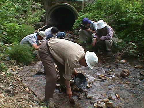 なんと岩田先生は、砂金採集用の黒いおわんを用意していました。このおわんは、京都の会社でつくっているそうです。さっそく、みんな一攫千金を夢見ました。鉱山跡近くの谷川で砂金捜しの開始です。おわんに土砂と水を入れて1時間程度ふるい分けをしました。一番熱心なのは岩田先生でしたが、何も見つかりませんでした。そのかわり小坂先生にフタリシズカの群落があることを教えてもらいました。