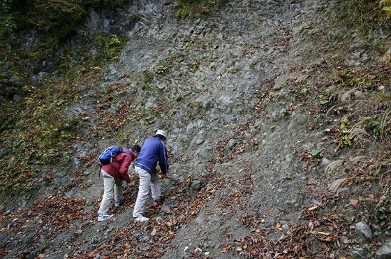 | 11月3日、文化の日、ヌクイ谷、宮川断層付近の巡検を行いました。高山市一ノ宮支所の駐車場に集まったのは、岩田、中口、坂本、中田の4人でした。岩田副会長に、旧宮村管轄の林道の鍵を借りてきていただきました。しかし宮小学校の生徒が参加する文化祭があるとのことで巡検は欠席でした。3人の巡検になりました。 天気は良いはずでしたが、あいにくの曇りで雨も降りそうです。まずは、宮の防災ダムへ向かいました。防災ダムの西側にはヌクイ谷断層があります。小規模な三角末端面もならんでいます。さらにヌクイ谷沿って峠まで行きました。天気があいにくで写真は無理です。次にもどり、防災ダムからツメタ谷に行きました。ここから鍵を使って餅谷林道に入りました。林道は宮川断層を横切るはずです。断層をすぎたあたりで、崖が見えました。崖は濃飛流紋岩からできていて、破砕帯ほどではないですが、岩石に割れ目が多くなっています。中口会員からここでの濃飛流紋岩について少し説明を受けました。底面付近の岩石があるようです。次に岩岳林道に入りましたが、断層らしき地形を見ただけでした。空も暗くなり雨も降りそうなので、まだ正午頃でしたが本日はこれで解散し、天気の良い日にまた写真を撮りにくることにしました。 |