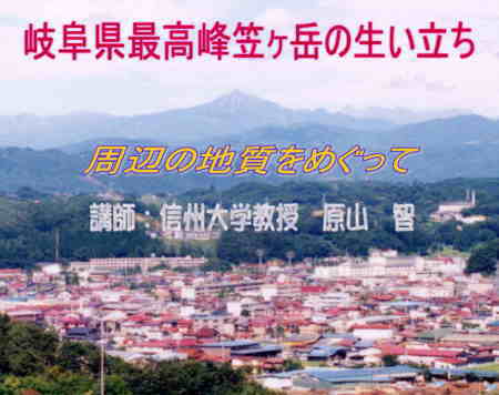 笠ヶ岳(標高2,898m)は、山頂を他県と共有しない山の中で岐阜県の最高峰 です。また、笠ヶ岳は、その秀麗な姿から名山として岳人の人気の山でもあ ります。講演では、笠ヶ岳の山体にある水平な縞模様に疑問をいだいたこと をきっかけに、笠ヶ岳の生い立ちのなぞにせまります。(講演会報告へ) |