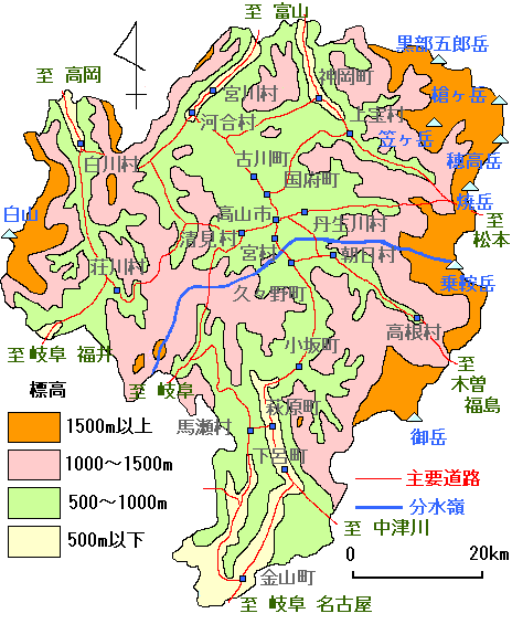 分水嶺は、飛騨中央部、宮村と久々野町の間を